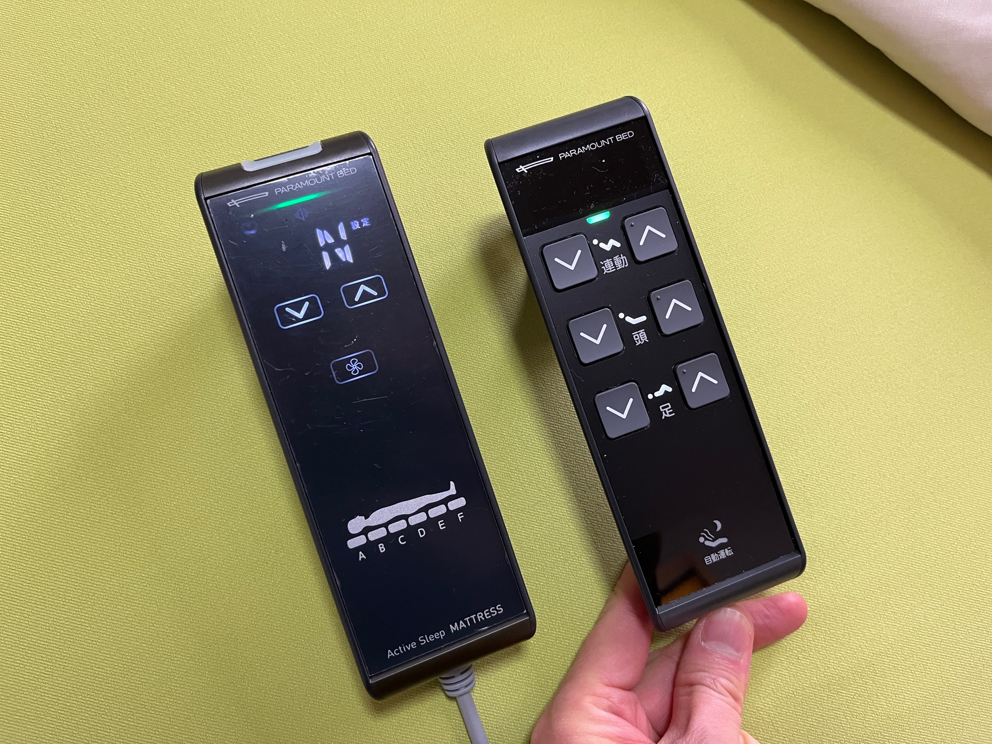 左側がマットレスの硬さを調整する「操作パネル」、右側が電動ベッドの傾きを調整する「手元スイッチ」。
