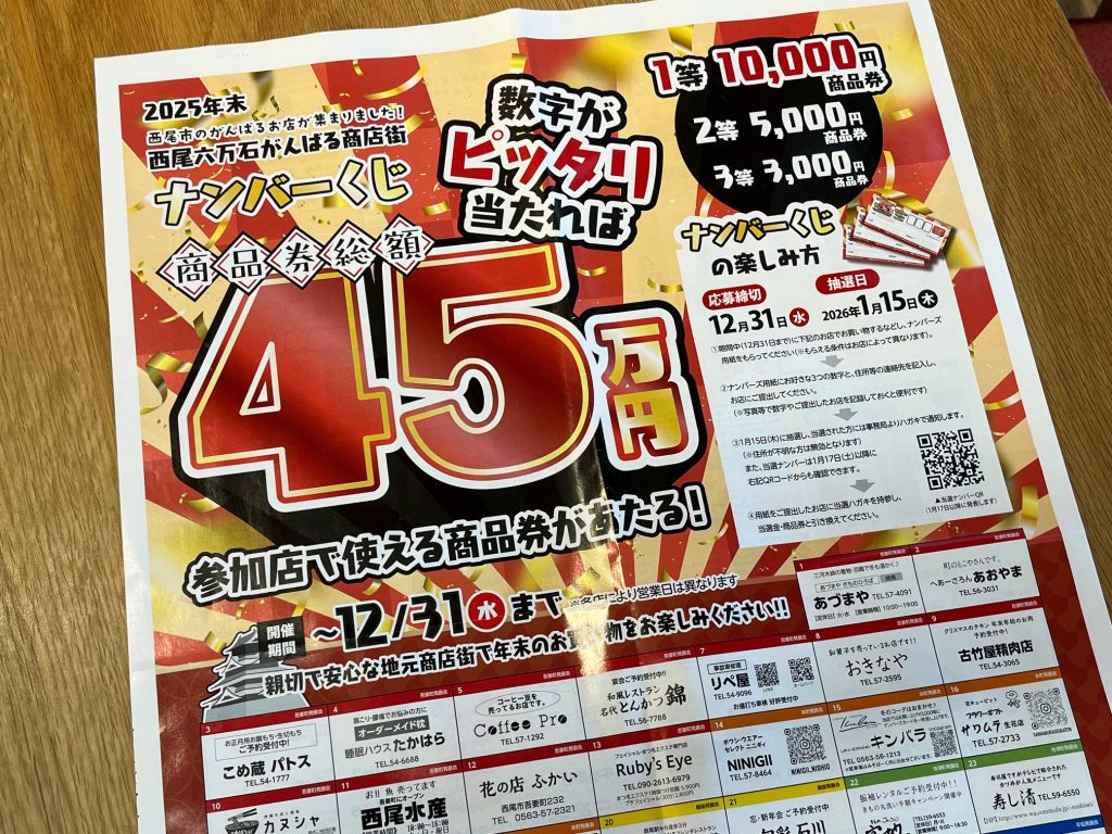 毎年恒例の西尾六万石がんばる商店街「ナンバーズくじ」、2025年11月より当店をご利用頂いたお客様にご参加頂いていました。