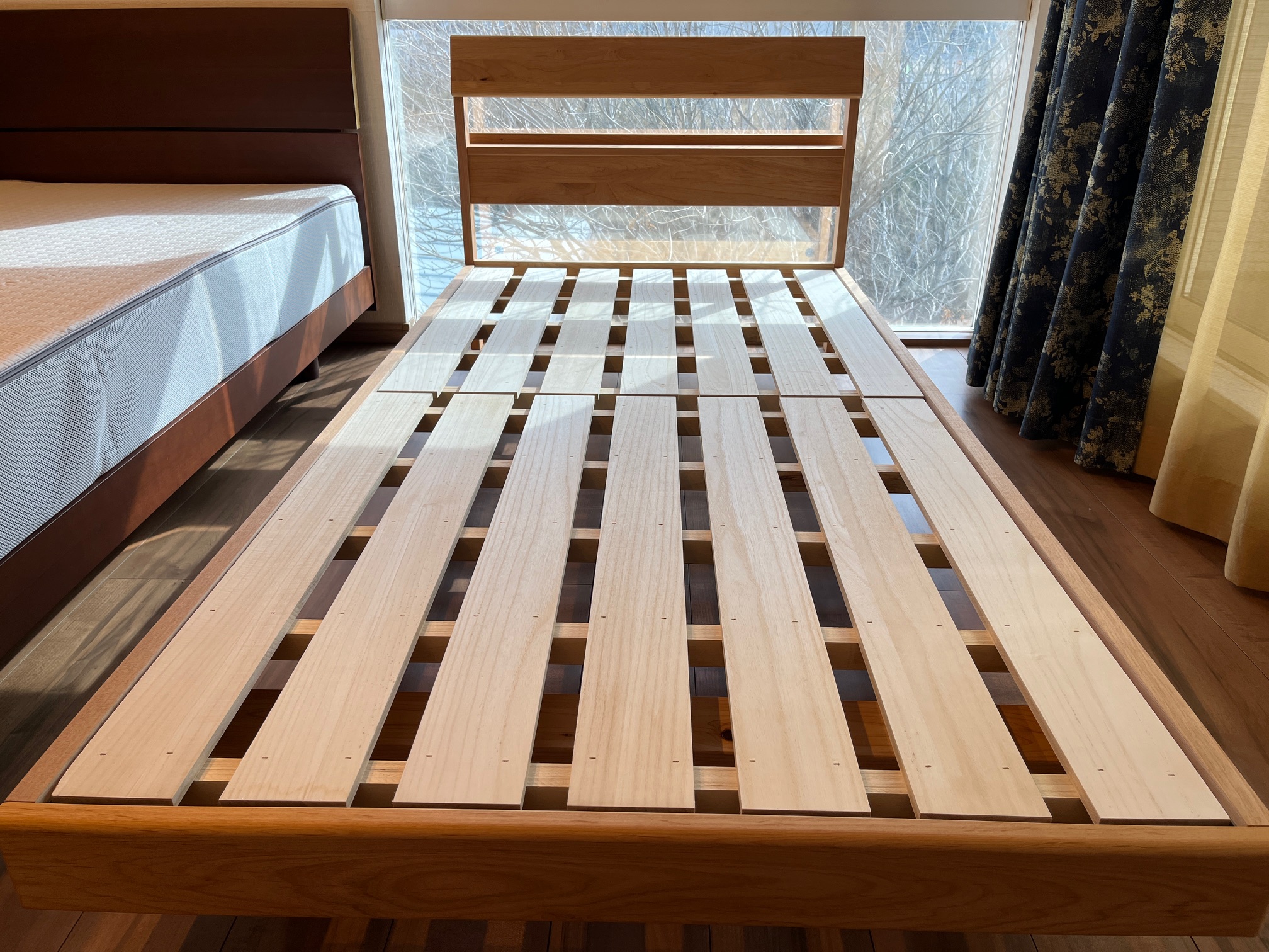 隣に置いてあるベッドと床板の高さがちょうど合いましたので、ベッドを並べても高さが同じになります。