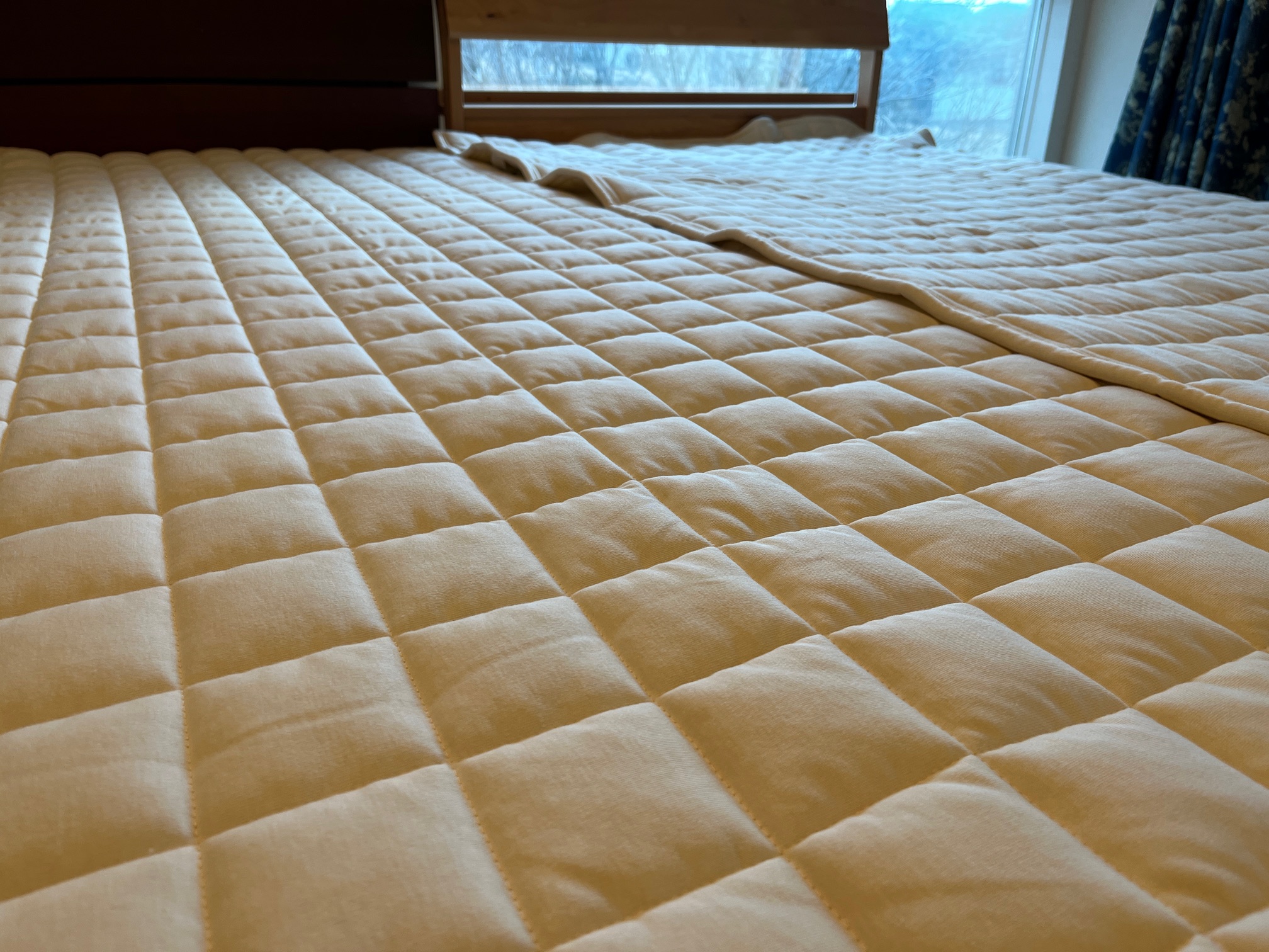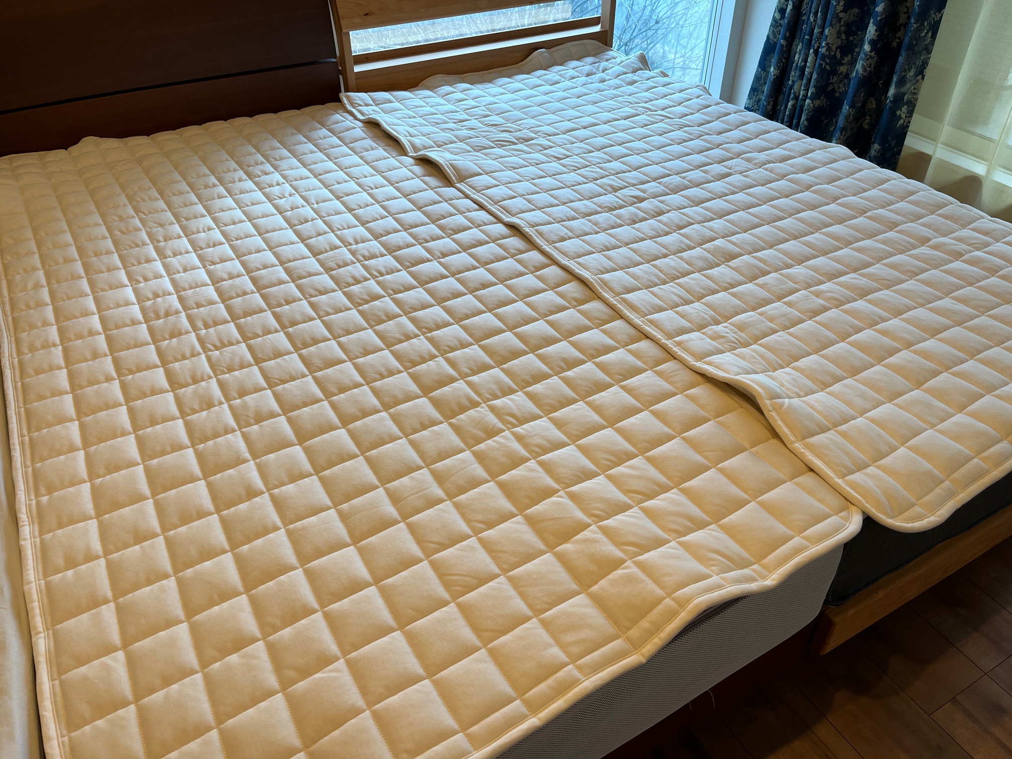 マットレスの上には、地元蒲郡で作っているフレンチウールベッドパッドを敷きます。